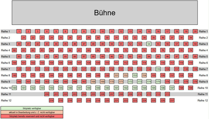 Unten finden Sie einen aktuellen Saalplan, auf dem ersichtlich ist, welche Plätze noch frei sind, welche reserviert wurden oder derzeit in Bearbeitung sind.